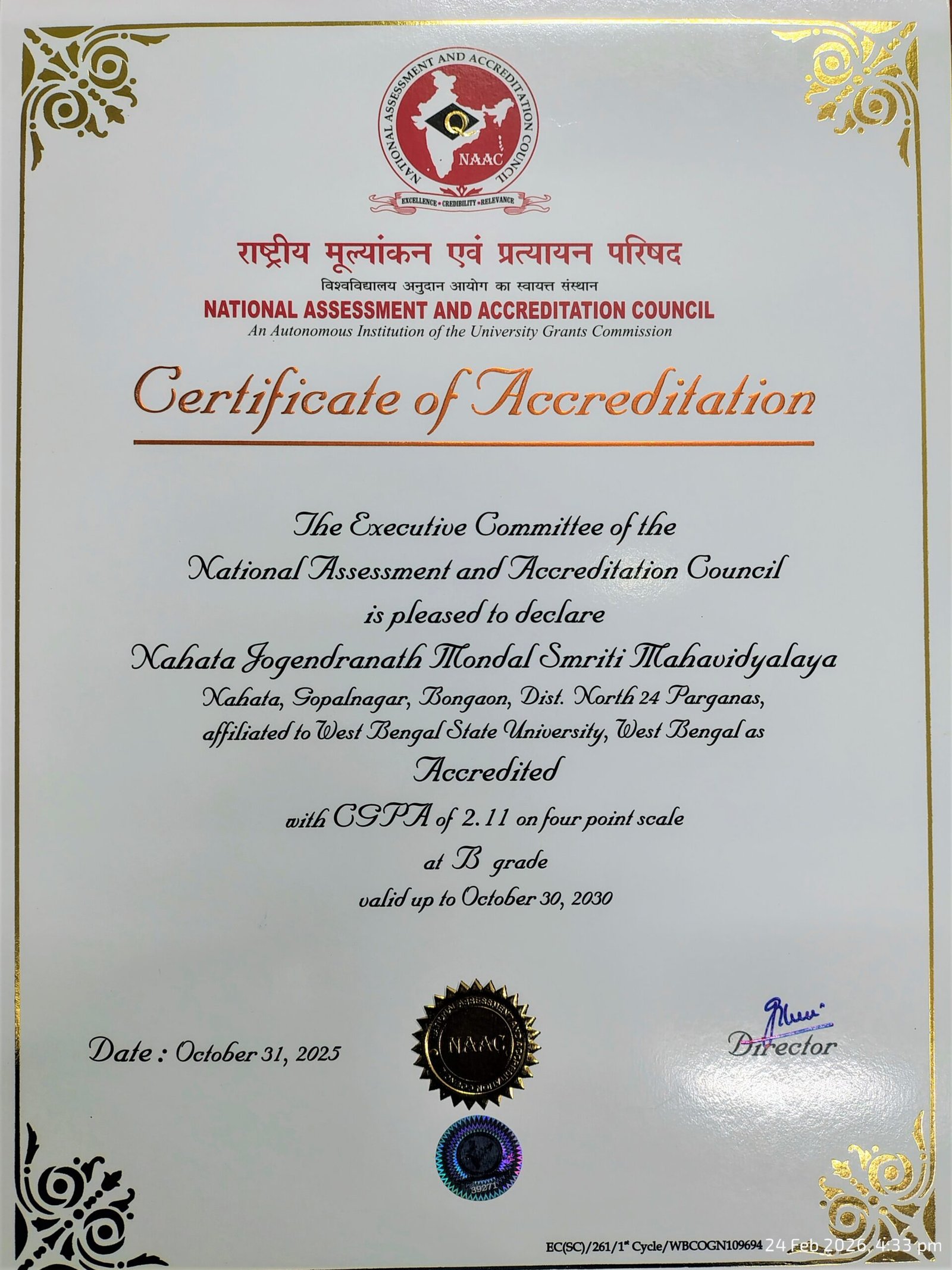 NAAC CERTICICATE OF ACCREDITATION