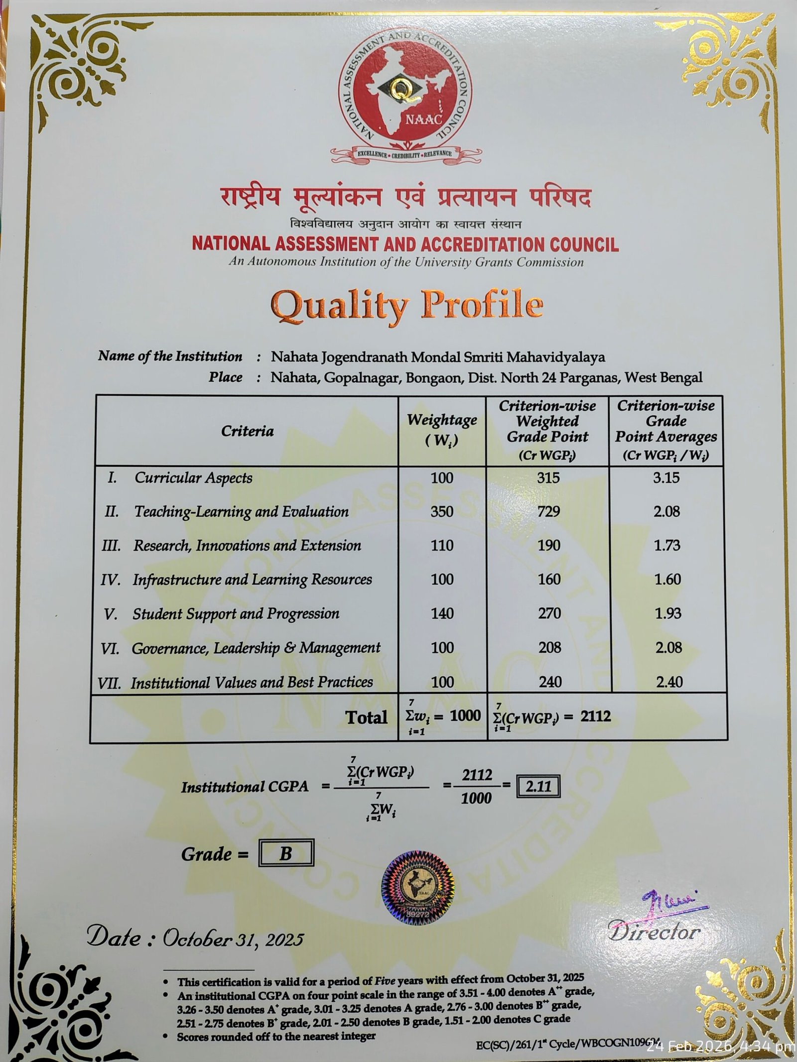 NAAC CERTIFICATE OF QUALITY PROFILE